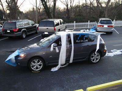 The groomsmen spent 2 hours in 30 degree weather decorating the get away car!